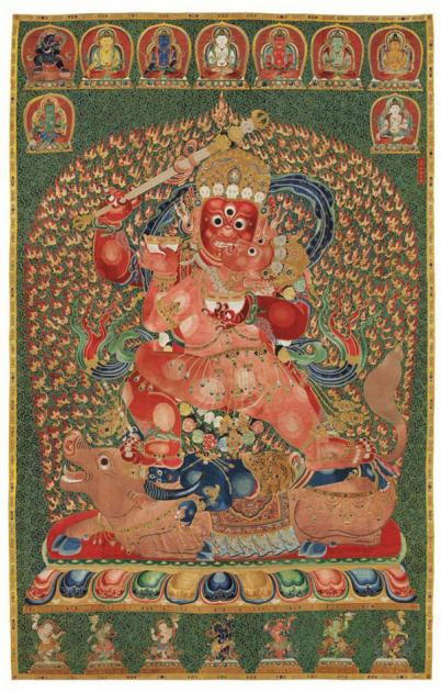 The Buddhist tapestry is intricately woven and dates back to the Yongle period of the Ming Dynasty between 1402-1424. The work measures 3.3m x 2.1m and shows Rakta Yamari, the red conqueror of death and his companion Vajravetali trampling over Yama, the lord of death.