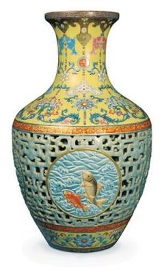 An auction record was set this week for a piece of Chinese art, when a 16 inch high ceramic vase decorated with 4 circular cartouches, each masterfully carved and enameled with carp (a symbol of plenty) beneath a primrose yellow trumpet neck sold through the small suburban auction room, Bainbridges in Ruislip, Middlesex UK.