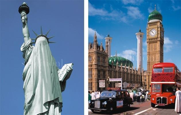 The Russian based photo-conceptualist group AES made up of artists Tatyana Arzamasova, Lev Evzovitch, and Evgeny Svyatsky began the Islamic project as an installation and performance with interactive communication with public purchasing souvenirs, filling questionnaire concerning their opinions about Future. It works as a kind of social psychoanalysis – visualisation of fears of Western society about Islam. In 1996, they launched “Travel Agency to the Future: Islamic Project” – a conceptual art piece that not only catapulted the artist collective to prominence but gained in controversy after 9/11. Images of famous landmarks and tourist destinations were digitally altered to look as if taken over by a radical form of Islamic culture. In conjunction, AES+F set up a travel office where souvenir items were sold with these images printed on them, and where visitors could “plan” a fictional holiday into the depicted world.