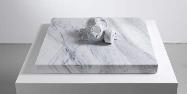 A ghostly, carved-marble gas mask, like a deaths-head emerging from a tomb, relates to the perpetual pollution experienced in the Chinese capital city, while the massing of bicycles also addresses a stereotypical national symbol in an uncompromising and unconventional way. Ai’s groupings of stainless-steel bikes – here configured in different modular shapes and layers of geometrically stacked structures – refer to the famous ‘Forever’ brand of bicycles that have been mass-manufactured in Shanghai since 1940. Once ubiquitous, this classic marque and indeed the perceived profusion of pushbikes on Beijing streets are now steadily dying out, to be replaced by smog-emitting cars on clogged highways and six-lane ring roads. The transparent Taxi Window Crank pieces are further examples of a surreal political system that insists on removing such mundane items from public life for fear that protesters would transmit their leaflets through car windows during sensitive times.