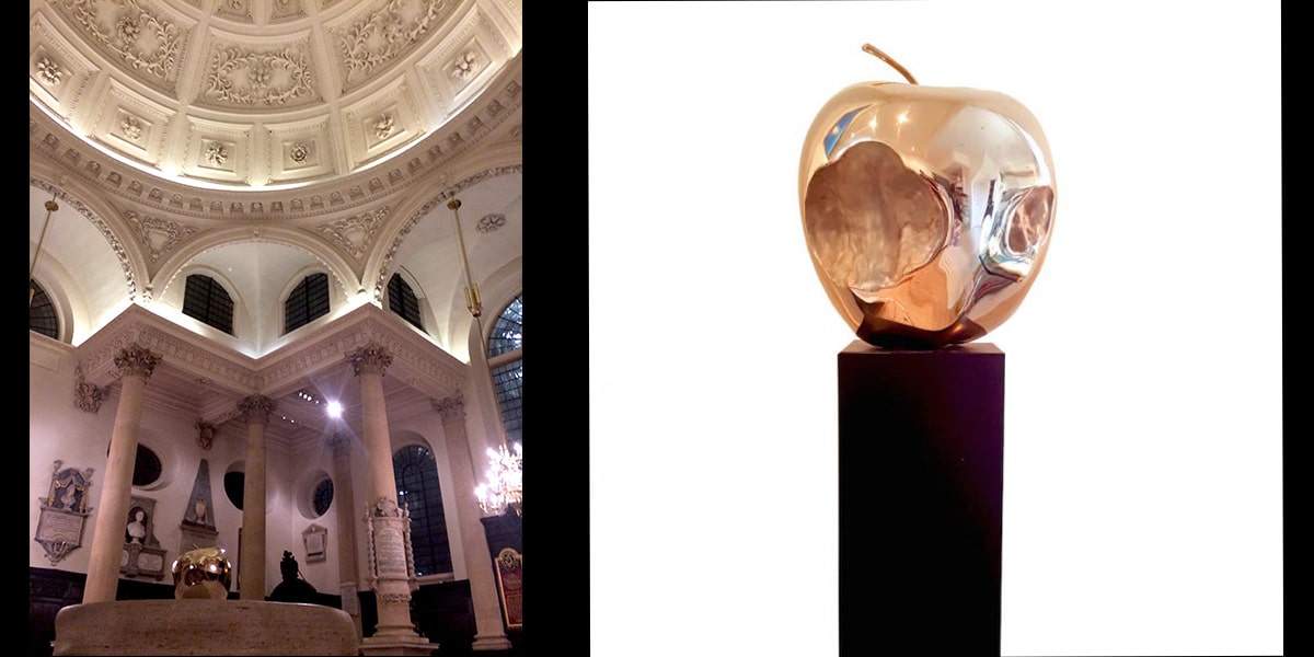 The bronze apple of creation called ‘Creations’ that Alexander De Cadenet placed on the Henry Moore Alter in the centre of the St Stephen Walbrook Church, City of London invokes an understanding around the apple of desire. The piece allows for a confrontation with one’s own soul. As you sit and look at the beautiful bronze apple you are given an experience of reflection into your inner world, the Christopher Wren dome of the Church brings housing to enable clarity and enlightenment. The elegantly curated sacred objects and architectural masterpieces, at St Stephen Walbrook Church, catalyses a profound spiritual understanding, an experience one can only stand under in respect after all the original meaning of curating is too look after people’s souls, sacred art, environments and sacred objects. Priest Revd Jonathan Evans of St Stephens Walbrook, who is taking his spiritual role as a curator of contemporary art and architecture, in the City of London, is bringing a refreshing light of hope for the complications that the City of London holds.