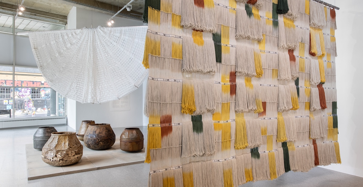 ADC: They’re a long-running series. After a while, I started dying them, but I’ve only just started with partial dying – that suggests tie-dye and makes them more painterly. I like to establish a dialogue with the space – here the mops touch the floor, and that reminds you to recognise their function – they could have been used for the labour of cleaning the floor.
