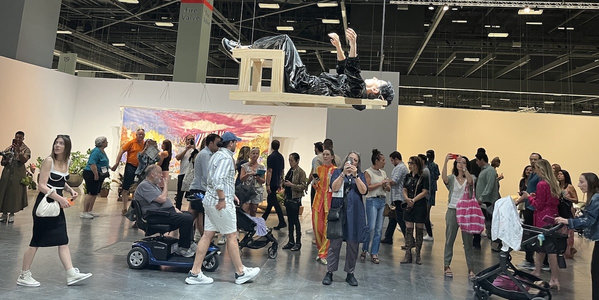 A few blocks south along the beach, Untitled, with 140 exhibitors, was one of the most vibrant satellite fairs. I made several discoveries like the witty and funny works at Bogota’s SRG Galerie of Colombian artist Juan Uribe who criticises western art historical discourse. I was also charmed by the Nicaraguan artist Marisabela Telleria’s textile works, with their sensual and elegant visual vocabulary, at Patrick Heide Gallery, London.