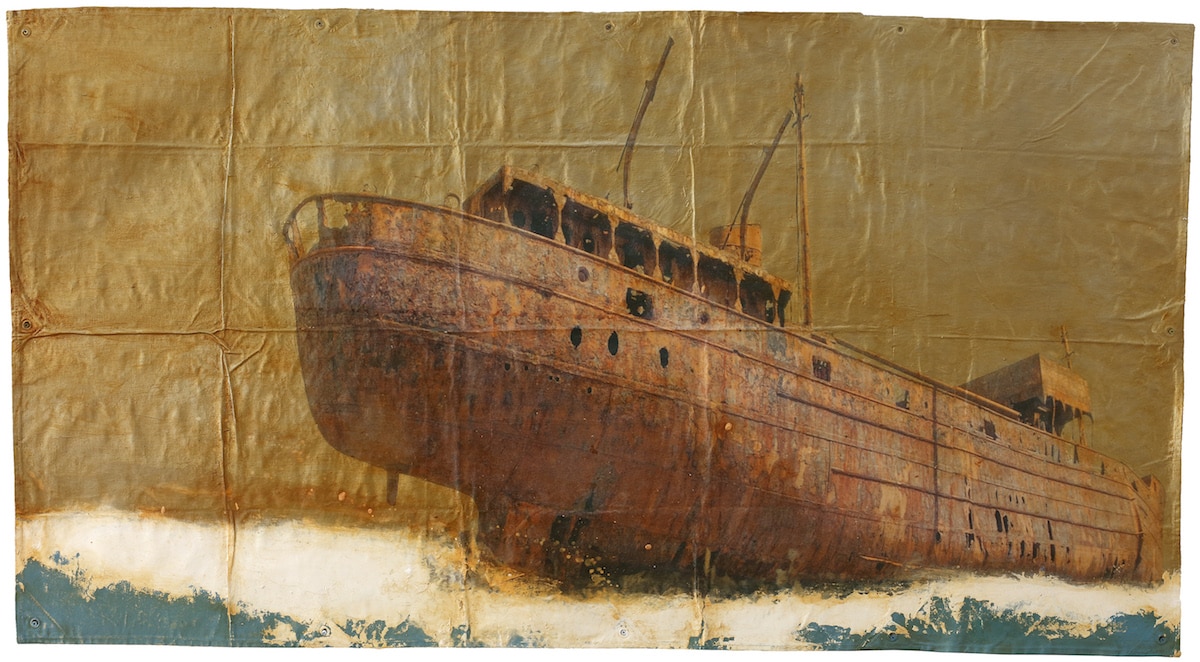 The other, Hughie O’Donoghue: Deep Water and the Architecture of Memory at Marlborough London, sees O’Donoghue using repurposed materials such as sackcloth, sandbags and tarpaulin as the base for a complex superposition of photographic images with layers of resin, acrylic and oil paint. Through the stunning and subtly nuanced images of shipwrecks, creeks and seascapes formed on the archaeological layers of these works, he excavates childhood memories to metaphorically investigate questions of memory and identity.