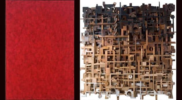 Lesley Hilling: Hilling has spent a lifetime experimenting with recycled wood, often from discarded pianos. She builds towers, which grow organically out of wooden fragments. Her studio is a cabinet of curiosities of junk furniture and other ephemera. Found photographs, camera parts, and books are all objects that are integrated into her striking, constructions. There is a strong sense of the past, something contemporary yet antiquated between the varnished piano wood and the old camera lenses.