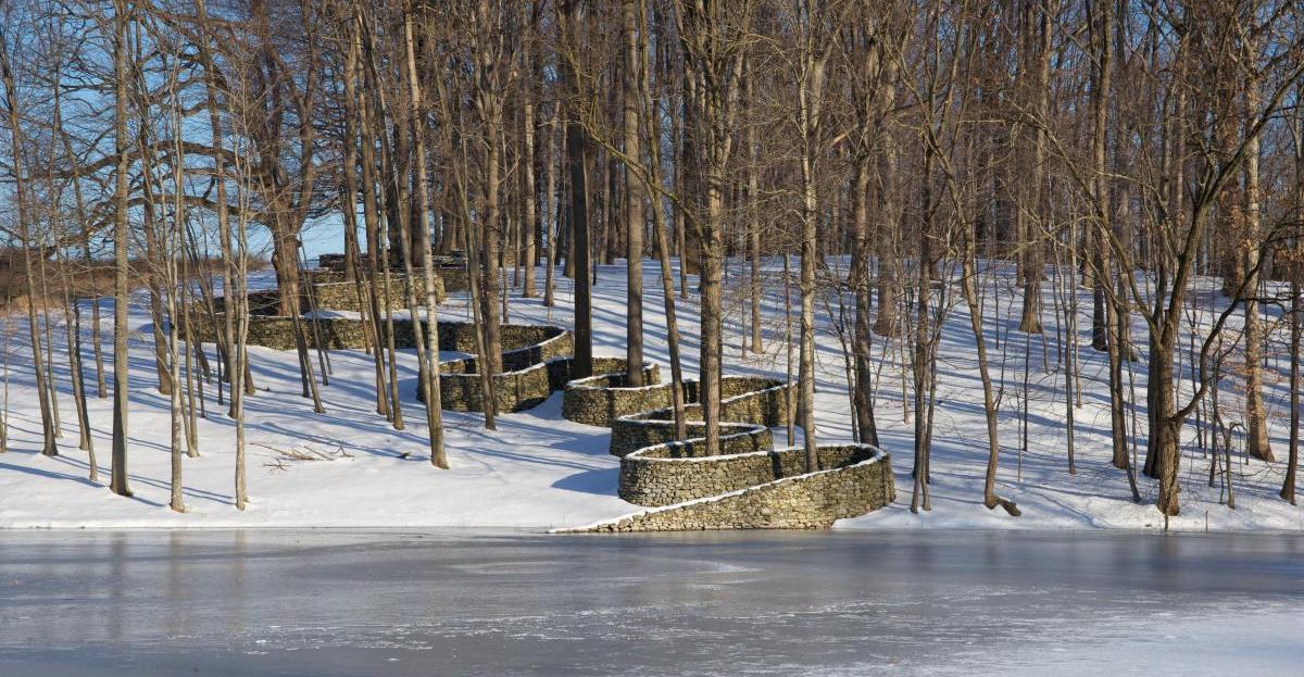 In 1989, Goldsworthy constructed his serpentine Wall that Went for a Walk in Cumbria. A decade later, he built the 2,278-foot stone wall, Storm King Wall, on the foundations of an old dairy farm wall found in the woods overlooking Moodna Creek in New York’s Hudson Valley. Made to last, it evokes a lost agricultural past. Using no mortar, he simply interlocked and fitted field stones together in the manner of the Yorkshire dry stone walls of his childhood, built for centuries on the moors and in the dales. Constructed in a coppice near a creek, it took three weeks, five men and 250 tons of stone to build. If a wall is a delineation between spaces, one that defines, say, the ownership between two fields or stretches of land, this refuses to play that role as it loops around and between trees and saplings on its way down to a pond, creating a relationship between ground, sky, water and trees.