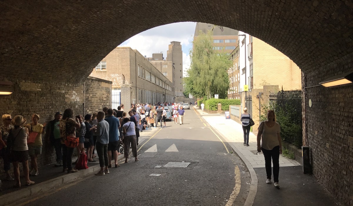 The queue snaked for a quarter of a mile down alleyways and under bridges for the event. Over 4,000 people visited the fair this year held for the first time at The Workshop in Lambeth High Street. (see top photo) yes this really happened! The one-day festival took place on the streets of Vauxhall’s vibrant new gallery district with the support of Newport Street Gallery and U+I Plc, It presented an eclectic line-up of over one hundred artists who sold exclusive pieces from the boots of both new and vintage Vauxhall cars.