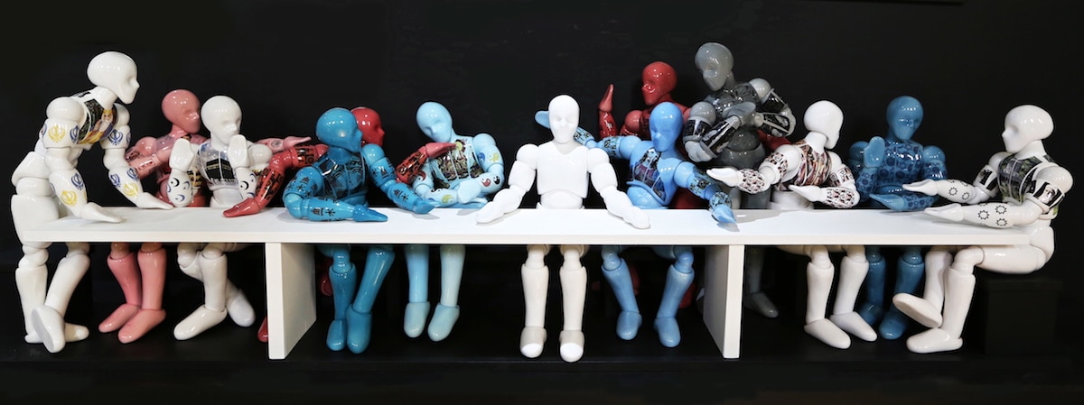 Similarly, ceramic artist David Millidge created a version of The Last Supper in which the disciples are all identical figures but decorated with a thin veneer of symbols and images representing different faiths. The faiths served, approximately in order of affiliated members, including Christianity, Islam, Atheism, Hinduism, Buddhism, Sikhism, Judaism, Taoism, Bahaism, Confucianism, Jainism, and Shintoism. Millidge, whose piece was shown at All Hallows in the Tower as part of the ‘Journey’ exhibition by commission4mission artists, says that his sculpture ‘portrays an optimistic vision of a future where all ideologies sit side by side in harmony.’ He writes that ‘if we are to continue living in a world where wars, conflicts, prejudice and persecution remain on the decline, we must continue to break down the barriers that divide us with acceptance and respect for the different faiths that we live by.’
