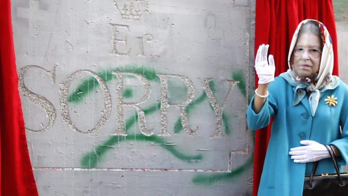 The faux event was organised around 50 children with a masked double dressed as Queen Elizabeth II. Modelling it on an English-style tea party. Helmets with British flags and bullet holes were worn along with moth-eaten Union Jacks waved by the guests.