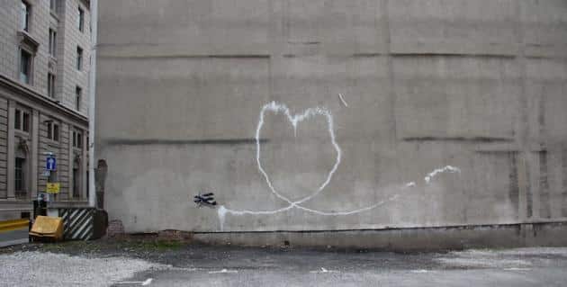 The work nicknamed the Love Plane, was painted in 2011 and showed a biplane leaving a heart-shaped exhaust trail behind it. The plane has now been removed from the wall of the outdoor car park on Rumford Street however the trail heart has remained on the wall.