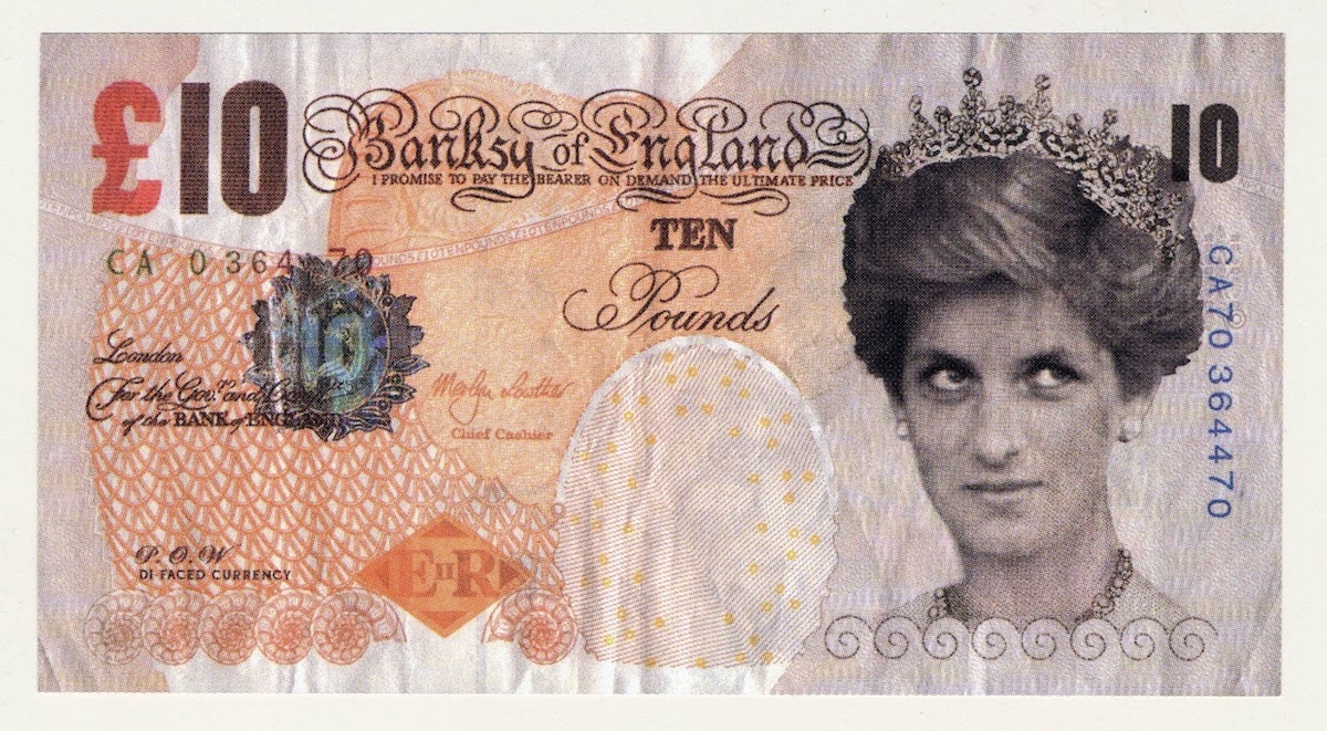 The print depicts a counterfeit £10 banknote with Diana, Princess of Wales, replacing the Queen. The work, titled Di-faced Tenner, was one of many thousands of copies created by the artist in 2004 as part of a stunt where the currency was scattered at the Notting Hill Carnival and at the Reading Festival.