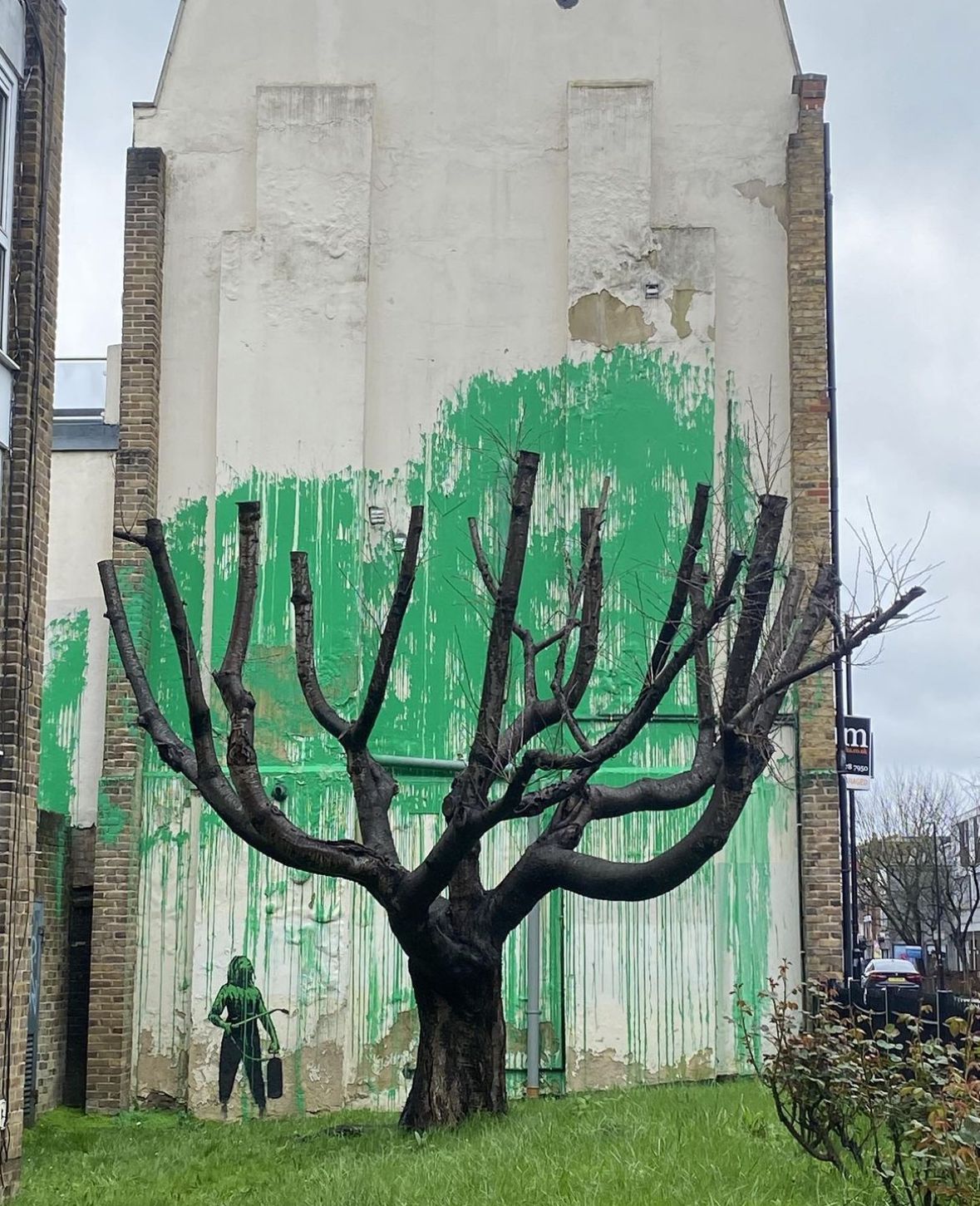This artificial canopy of leaves, created using the unorthodox method of a fire extinguisher, conveys a profound message touching on themes of loss, resilience, and the human impulse to manipulate or imitate the beauty of nature. The juxtaposition between the barren tree and the lively painting evokes a stark visual and conceptual contrast, inviting contemplation and interpretation. Yes, this mural holds all of the hallmarks of a Banksy!