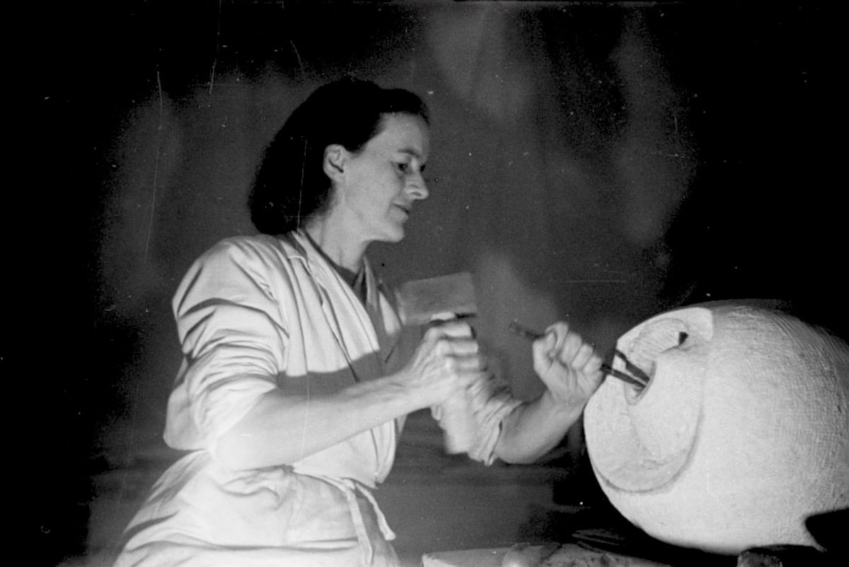 Top Photo: Barbara Hepworth at work on the stone carving ‘ Eidos’ (1947-48; National Gallery of Victoria, Melbourne, Australia). Taken in her studio at Chy-an-Kerris, Carbis Bay, St Ives © Bowness