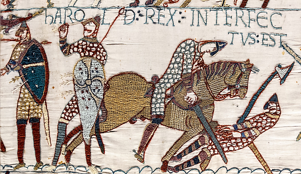 The tapestry consists of some fifty scenes with Latin tituli, embroidered on linen with coloured woollen yarns. It is likely that it was commissioned by Bishop Odo, William’s half-brother, and made in England—not Bayeux—in the 1070s. In 1729 the hanging was rediscovered by scholars at a time when it was being displayed annually in Bayeux Cathedral. The tapestry is now exhibited at the Musée de la Tapisserie de Bayeux in Bayeux, Normandy, France