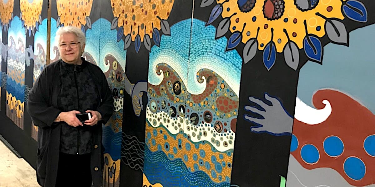 The basic structure of ‘A Creature Chronicle’ is a 24ft in diameter circle of panels painted on both interior and exterior surfaces. As an architectural space, it references a fire pit, a cave, a chapel, a hut. It is a place of contemplation and conversation. The circle is a universal symbol appearing in all world religions and science and is used in this work as a design element loaded with multiple complex symbolisms that repeat and spin their overlapping meanings.