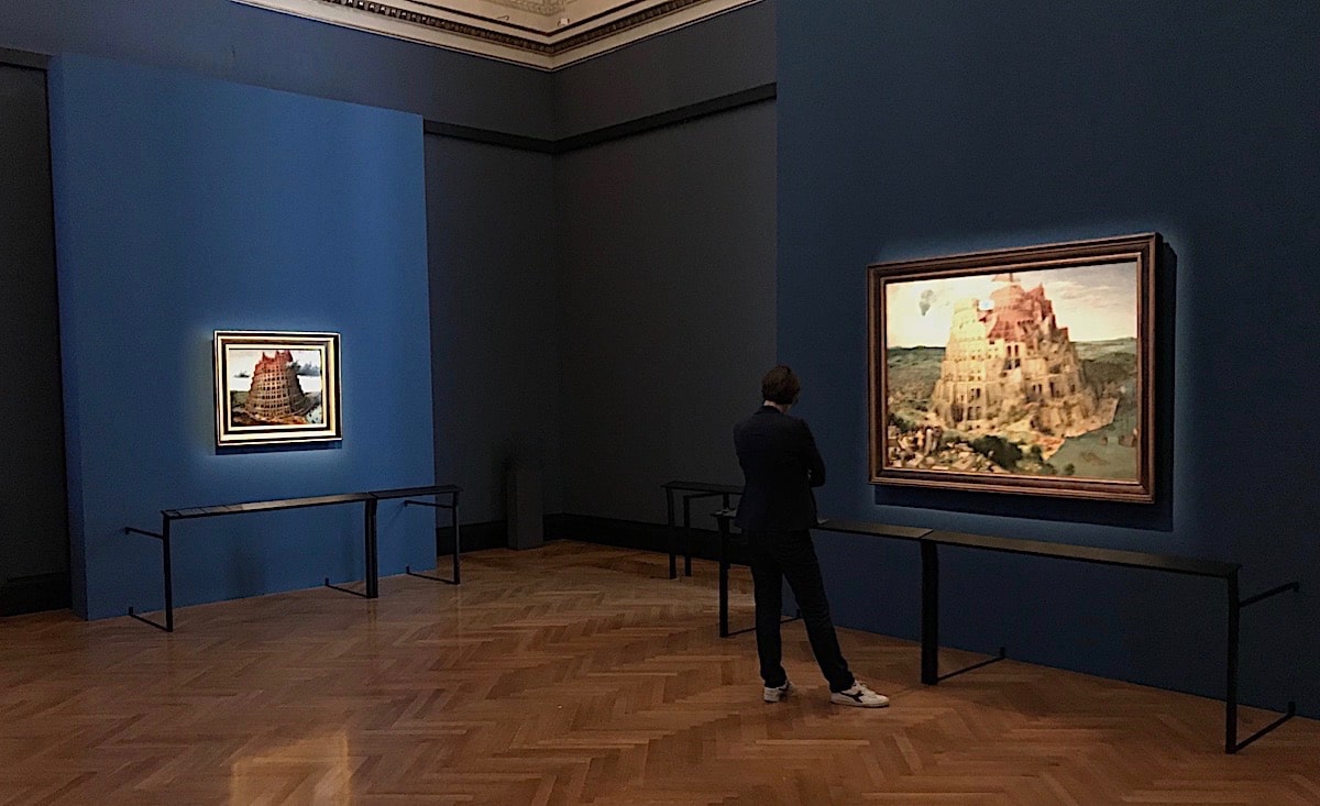 The show marks the 450th anniversary of the artist’s death with over 90 works including paintings, drawings and prints. The exhibition has been superbly hung and lit within the sumptuous architecture of the last palace of the Hapsburg Empire. The Bruegel exhibition has broken with tradition by removing a panel from its frame and displaying it in a large glass vitrine. This allows the viewer unprecedented access to study the back and front of the work. The bowing of the large panel also becomes far more pronounced in this unusual perspective. Other works are displayed eye level set into cases allowing the viewer to get close in order to take in the texture and colour of the pigments.