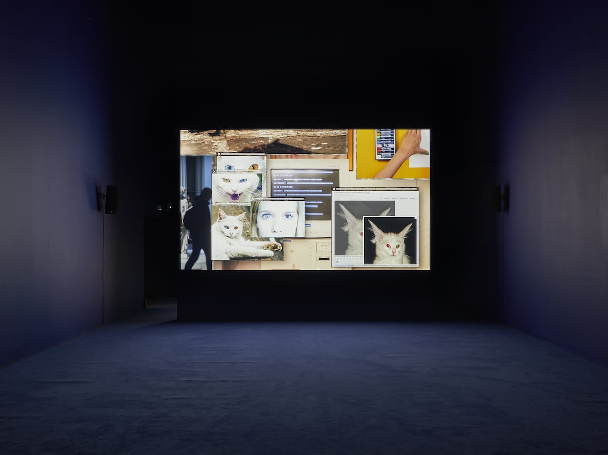 Camille Henrot’s single-channel video Grosse Fatigue blends together origin narratives from many cultures and disciplines combined with images of work, exhibits and spaces at the Smithsonian Institute in Washington DC, where, as part of the Smithsonian Artist Research Fellowship, she was granted permission to film aspects of the collections. To these, she adds ‘images found on the internet and scenes filmed in locations as diverse as a pet store and a domestic interior that appear like pop-ups at the screen’s surface.’