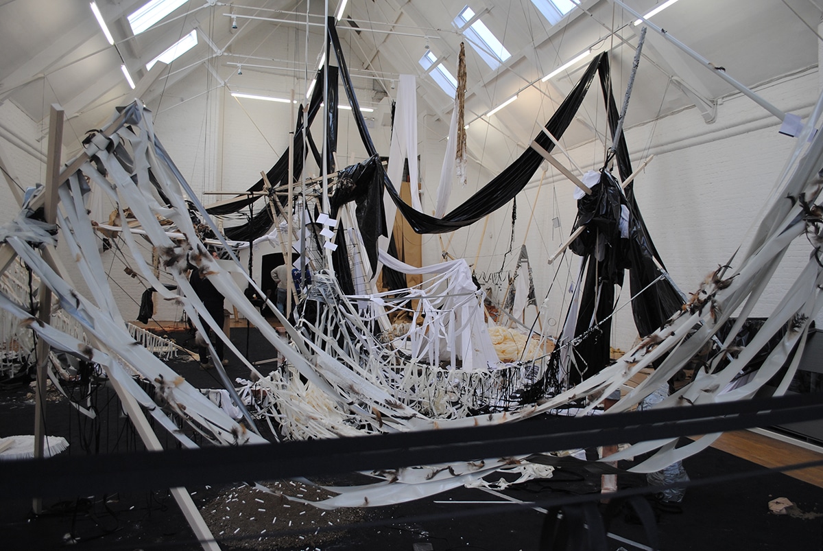 The resulting configuration of materials allude to functionality and structure, or perhaps deconstruction; a bulldozed favela, the detritus of makeshift dwellings, littered with paper, and chalk, dust and soil.