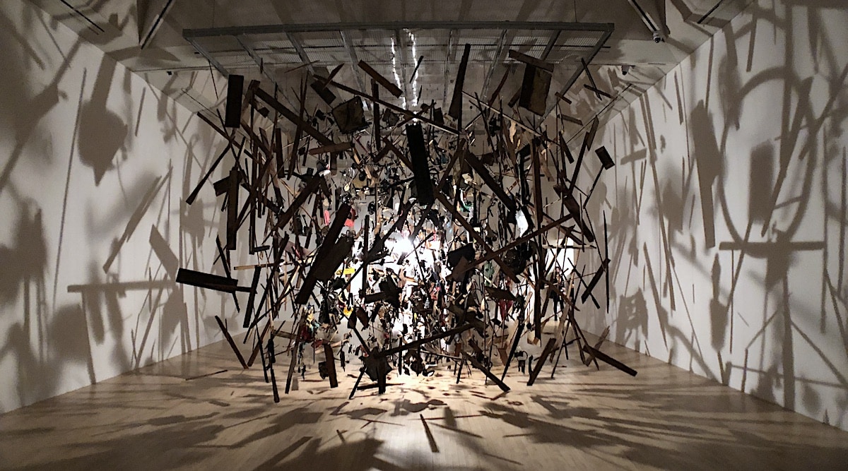 Making an artwork is like throwing a pebble into a still pond. The artist may not be able to predict where the ripples will lead. Cold Dark Matter, as Cornelia Parker’s 1991 piece was called, made connections between the world of science, space and the everyday. After the explosion, she collected and suspended the blackened, twisted objects from transparent wires in the Tate Gallery. These were lit with a single light bulb that hung in the centre of the installation. The apparently floating debris might have been the result of the Big Bang, a terrorist attack or be a 3D model demonstrating chaos theory. The dramatic shadows on the walls added both drama and a sense of disembodiment. Boundaries were blurred. Edges dissipated. Underlying Yeats’ famous quote from his poem The Second Coming that: ‘Things fall apart: the centre cannot hold.’ Here, then, was a visual metaphor for the political, spiritual and cultural decay of a world constantly being altered by violence that, through its reconfiguring, signalled the possibility of regeneration. For Cornelia Parker, the world was constantly being bombarded with images of violence from action films and comic strips, along with relentless, never-ending reports of conflict and war. Exploding a garden shed was a simple yet effective visual embodiment of the end of history. A history defined by capitalism and industrialism, where issues such as colonialism, global warming and traditional gender roles were beginning to take centre stage.