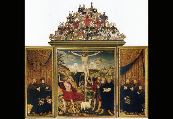 The altar depicts Lucas Cranach the elder with Martin Luther (1483-1546), and emphasises the protestant political affiliations of the region’s ruling princes at the time as well as the members of the congregation. Lucas Cranach the elder is in fact present in the alter’s depiction; The crucified Christ is in the centre of the panel. His figure is repeated on the left side conquering an evil demon. In the background, there is a scene of the Expulsion from Eden, and immediately on the right of Christ, St John the Baptist points one of his fingers at the central figure. Next to the Baptist stands Lucas Cranach the Elder.