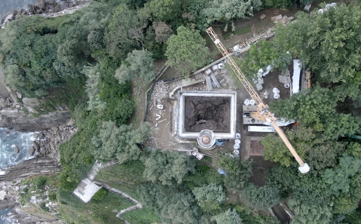 And then the door to the lighthouse is opened and the floor in front of us falls away to reveal a gorgeous cavern of bronze. Planes of rock-like slabs intersect with rippling, contoured elements forming a lacy network of grooves and hollows (derived from San Sebastián’s actual coastal formations), all of them sloping down towards a curvaceous crevasse at the work’s epicentre. Metal stairs and decking lead us up and around to offer alternative vantage points onto this geographically authentic-seeming construction. Iglesias – whose practice is very much about revealing the beauty of the natural world through her lovingly conjured creations of rock, cavern, crevasse and water – hopes that this new kinetic attraction will draw more people out into nature, onto this spot, and enrich their appreciation of the Basque country’s unique ecology. ‘It will be a place to observe and think, to reflect on nature and the importance of conservation,’ she says in a film accompanying the launch of the work.