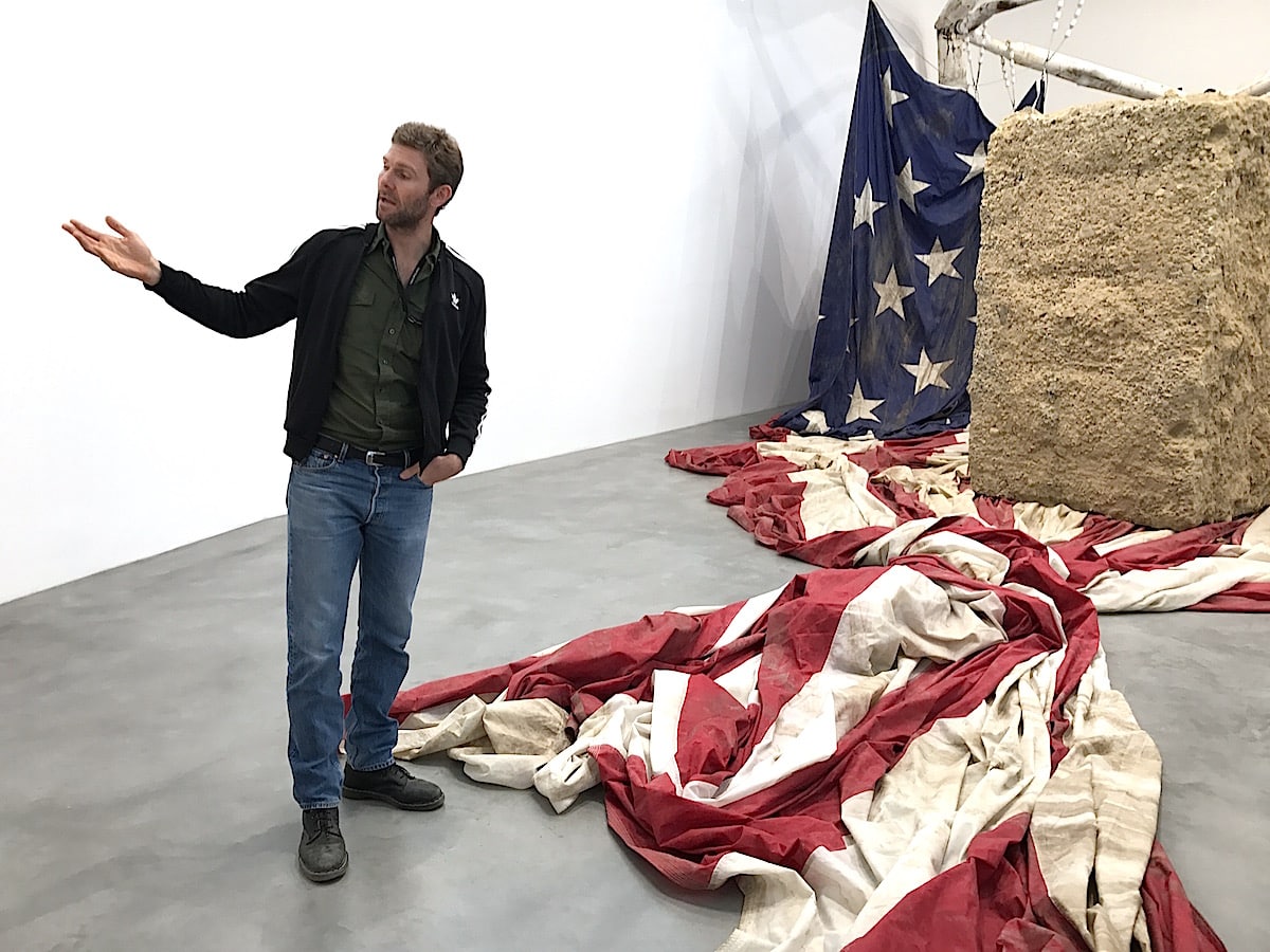 Another feature is the way you are actually introduced to what follows. The first room is occupied by a huge bale of hay shaped concrete block, planted on top of a vast crumpled American flag. In present circumstances, coincidentally or not, this reads like a comment on the Jasper Johns retrospective, currently on view at the R.A.