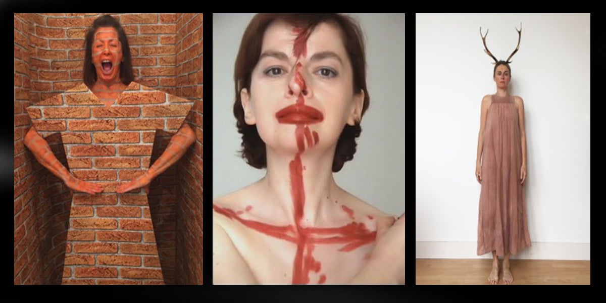 Photo Credits: Portrait image + Smudged lipstick. Artist: Maja Spasova Title:‘Lipstick Crucifixion’ centre – Horned woman image, Artist:Mieke Vanmechelen Title:‘I (non) I’ Right – Woman and red bricks image, Artist:Susan Swanton Title:‘Invisible Women Left