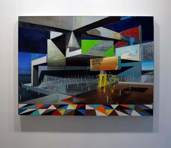 As part of the artist’s practice, Coyle actually begins by painting figures into his multifaceted constructs, then slowly through the layering and deconstruction of the elements of the image, the working, and re-working of the piece – the artist subsequently removes the figure entirely.