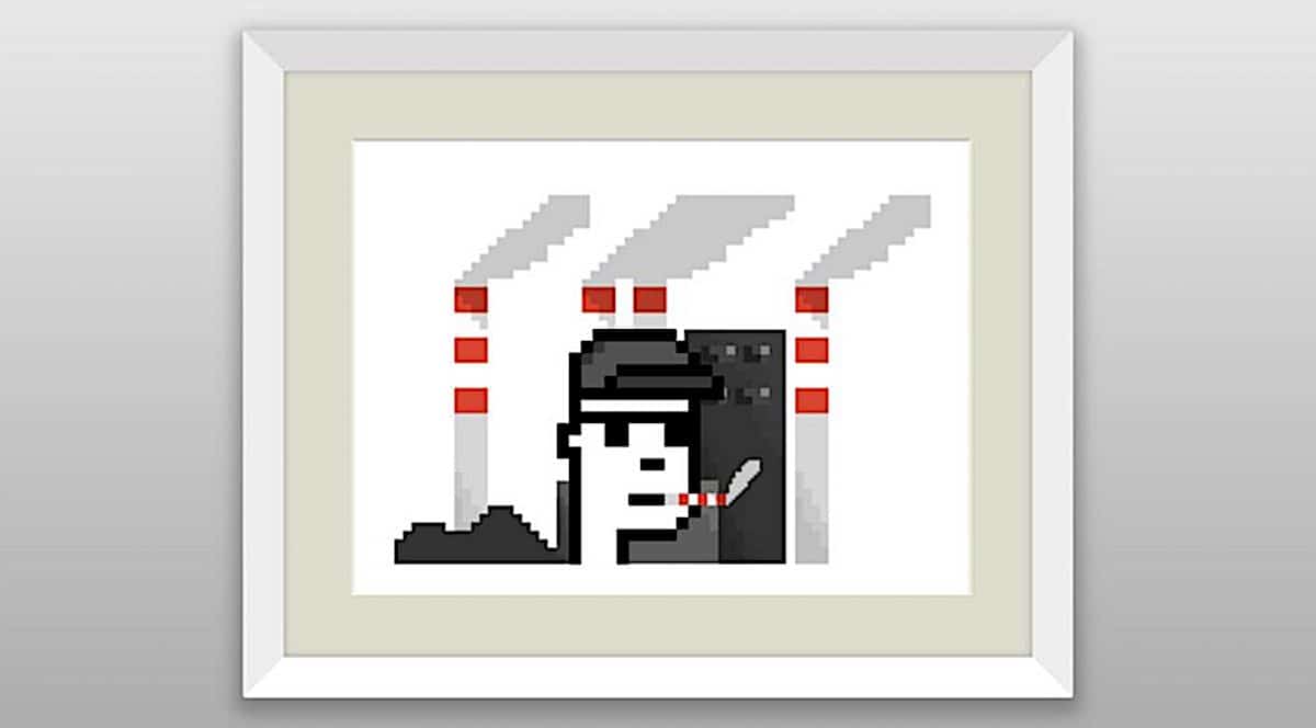 The artwork depicts a ‘Punk’ character smoking a cigarette with three smokestacks in the background. Entitled ‘Great Redistribution of the Climate Change Disaster’, the NFT is an 8-bit style image similar to images made famous by Super Mario. It appears to be a statement on climate change, a subject close to Banksy’s heart.