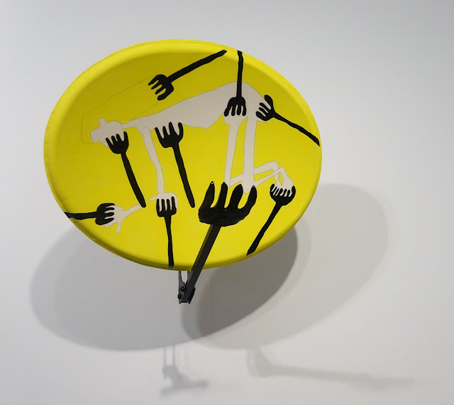 Recent Max Mara prizewinner Emma Hart’s stand of ceramic satellite dishes sold out fast, and their surface cheer and witty anthropomorphism no doubt helped that along, together with the simple delight of finding a new kind of dish made from clay. Yet such dishes are increasingly redundant, even were they not made useless by their material; they publicly indicate that something private is going on, which could stand in for many a trauma; and their content – like all Hart’s work – carries plenty of scope for anxiety, from spilled drinks to multi-eyed surveillance to this figure’s seeming at once threatened and supported by forks.