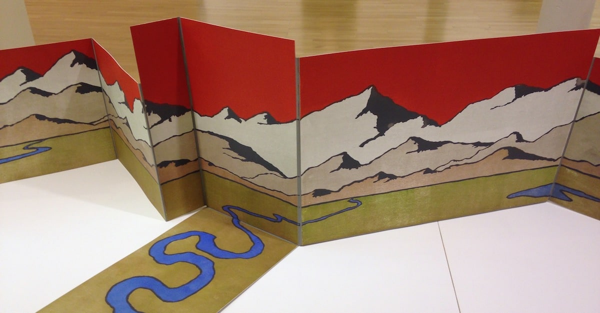 Yet his material is often cheap: recycled junk like his iconic ‘Twin-Tub & Guitar’. A large 2015 cardboard sculpture ‘Plain Ranger’ inspired his current ambitious 8 meters, 58 piece woodcut “Lost”, exhibited here. Printed & bound in Italy by Umberto Giovannini & Luigi Castiglioni, it’s a spectacular, 3D colourful zigzag construction which concertinas into a book.