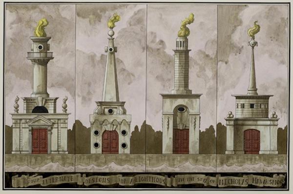 Image: Pablo Bronstein, Four Alternate Designs for a Lighthouse in the Style of Nicholas Hawksmoor, 2014, Courtesy Herald St