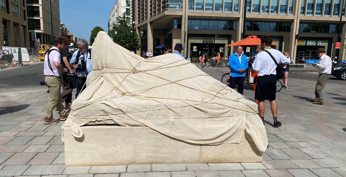 The internationally acclaimed sculptor Gavin Turk has unveiled a new artwork at the heart of the CB1 development in central Cambridge. The sculpture, named ‘Ariadne Wrapped’, is positioned outside the city’s central station and described by the artist as an “out-of-focus classical form” that plays against the colonnades of the station itself.
