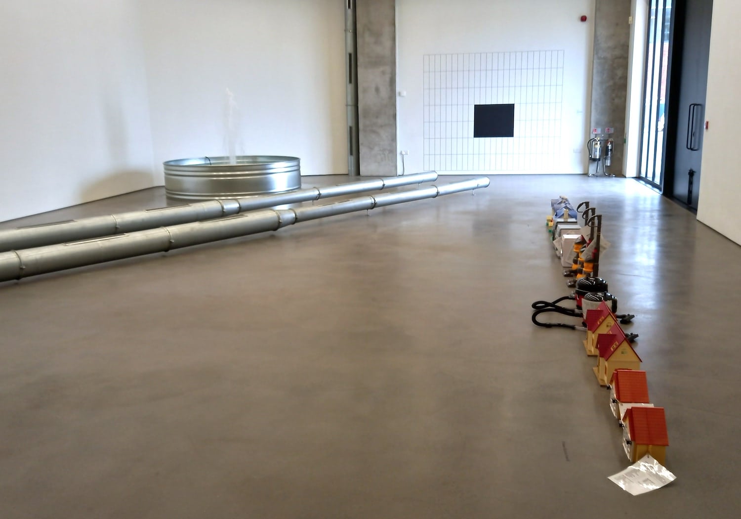 The score for ‘Violets 2’ reads: ‘All parts of a ventilation system removed from Netwerk Aalst Bar during its 2017 refurbishment are reinstalled within the space of the exhibition and fixed on the floor. Using as much of the material as possible while keeping it all interconnecting. Spare pieces that do not fit this configuration are bracketed together in smaller formations. A welcome sign is installed.’