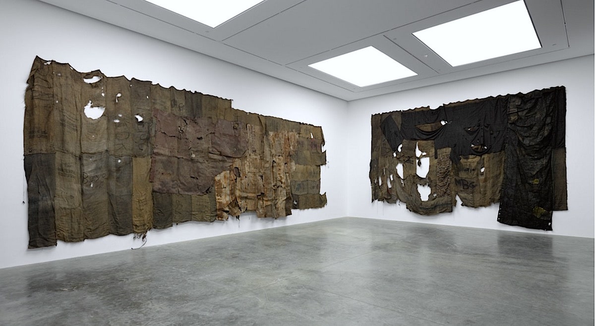 The media traditionally sculpted by the artist is made from jute sacks used to transport cocoa, coal and other raw materials or food. The sacks are prevalent in Africa and other continents at the center of trade and economic growth symbolic of transport, exchange, exploitation and wealth accumulation. In “Ziza Sullo” and “Crop Estate” the charcoal sacks have been decorated by scrap metal tarpaulin and metal tags. In “Out of Bounds” Somptuousat the 2014 Venice Biennale Ibrahim had covered a long path of 300 meter-long, 3,000 kg patchwork installation entirely made of old jute sacks that occupy the Corderie street, on the southern side of the Arsenale.  It was designed and conceived like for the triumph of a Roman emperor made of rags and sumptuous and breathtaking.