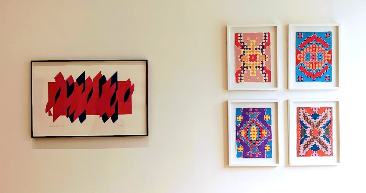 Top Photo: Bridget Riley (Red Red Blue, 2010, Screenprint in 3 colours edition of 75) and Dominic Beattie (Glyph (1,2,3,4), 2021, Spray paint and oil pastel on cotton rag paper