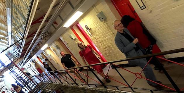 Artangel has taken the grim interior of the George Gilbert Scott Grade II-listed building and transformed it into a series of exhibition spaces. Much of the graffitied walls and doors remain including an emergency button in one cell labelled ‘Room Service’. Space and setting is a powerful backdrop which sometimes competes with the artists’ works. It’s a grim reminder that this was a real prison only decommissioned three years ago.