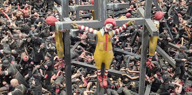 Yet the artists attention to detail is never more obvious than in their miniaturised apocalyptic landscapes; the minutia of degradation and destruction, iconoclastic works of vitrine-encased dioramas; Hieronymus Bosch-style miniature Hell-scapes, in which zombie-Nazis fight for superiority with multiple Ronald McDonalds and his burger-headed fiends.