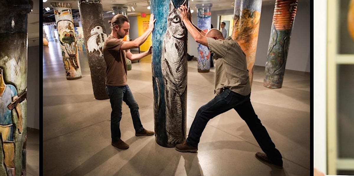 “Pipe Brothers: Tom and James Franco” is an exhibition consisting of nine large carved and painted ceramic sewer pipes, which measure seven and a half feet tall and weigh nearly 750 pounds apiece. It runs through Sept. 23.