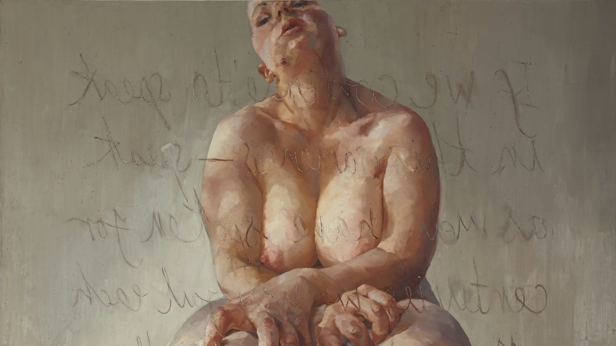She sits balanced on a high stool naked in front of a mirror, her white sling-backs hooked around its slender neck to balance her heavy body. Her bulbous breasts hang to her waist. Her head is thrown back, eyes closed, hands clawing at the flesh of her ham-like thighs. Scribbled into the paint, in mirror-writing like graffiti reminiscent of Cy Twombly’s scrawls, are gobbets of text by the Belgium feminist writer, Luce Irigary that say: If we continue to speak in this sameness – speak as men have spoken for centuries, we will fail each other.