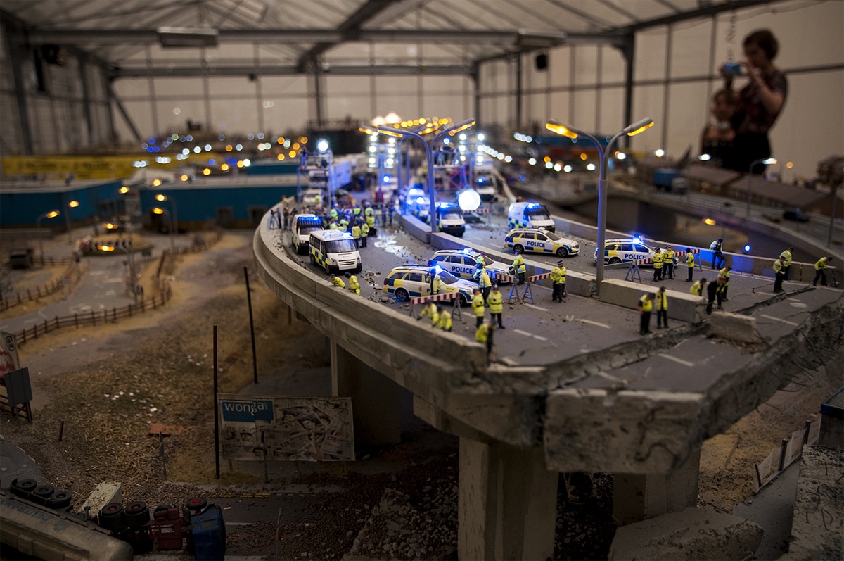 The Aftermath Dislocation Principle (ADP) the latest work from artist Jimmy Cauty, housed in a 40 ft shipping container is a monumental post-riot landscape in miniature – arriving in Oxford between the 25th and 27th November, before it continues its country-wide tour of ‘riot sites’ until Christmas Day. This dystopian model village is set somewhere in Bedfordshire, where only the police and media teams remain in an otherwise deserted, wrecked and dislocated land – all in 1:87 scale and viewed through viewing ports on the side of the container.