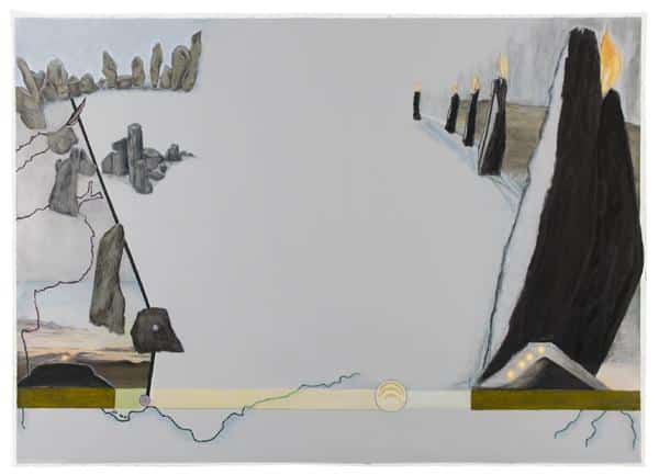 Baer layers her imagery, combining multiple styles and sources in a single painting. The careful order of an Ordnance Survey map, tracing the path of a river, will be overlaid with the Camden Town gothic of a crow silhouetted against a moon, for example. These visual languages function as both signs and patterns. Maps; astrological, geographical, epitomise Baer’s concern with representation as a mediator between us and the world. The Neolithic Hurlstone, a recurring motif, seems to function in a similar way here. Testament to a time long past, in the sense that it can be scientifically dated, and the locus of a myth fabricated in attempt to understand the past in a time before science could pinpoint it with such accuracy, the Hurlstone is emblematic because it simultaneously speaks of time passing in the abstract and its cultural demarcations.