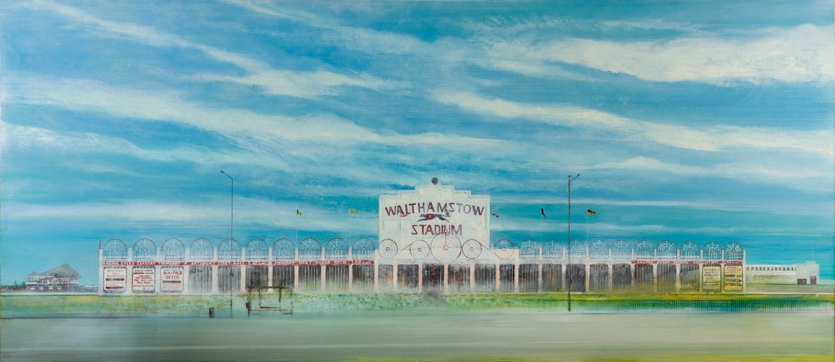 One of his most iconic paintings of this period is the doomed Walthamstow dog track. An Art Deco building that exemplifies one of the East Ends abiding traditions, betting. The ground, originally built and used by the Walthamstow Grange Football Club became known, by 1929, as the Crooked Billet Greyhound and whippet track. Winston Churchill addressed 20,000 people there in the 1940s while canvassing for re-election. The stadium has had a checkered history as a motorcycle speedway, a car racing track and the home to Charley Chan’s nightclub that was built under the clock tower. In Jock McFadyen’s Popular Enclosure, 2005 the building is shown at the end of its life, standing against a streaked sky like a once beautiful film star who cannot quite believe she’s no longer in vogue. Its grimy desolation rings with the lost voices of those who came to spend the day ‘at the dogs: the second-hand car dealers moved out to Essex, in for a flutter, the trainers in flat caps urging on their whippets to come in first. It’s as though their ghosts have been absorbed into the defeated fabric of this once bustling building that stands as a metaphor for the fluctuating fortunes of a dying community.