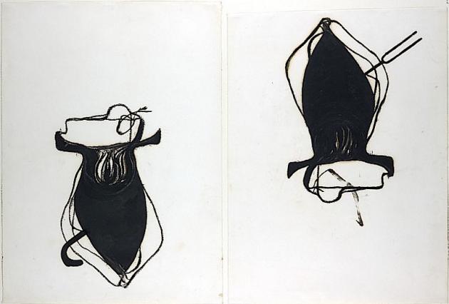 The Artist Rooms Collection includes famous examples of early drawings of women. For Beuys, women were figures of strength, who represented the dynamic principle and were more attuned than men to natural processes. Men, on the other hand, tended to be ruled by their rational minds and were more rigid in the way they behaved. But it was animals, above all, that held a special place in Beuys’s cast of characters, especially hares, stags, swans and bees. They were the very embodiment of natural laws and processes and Beuys used them in his work to represent various shamanistic ideas. For example, the hare was connected with the female principle and was in close touch with the earth, while the stag was connected with the male principle and, following ancient lore, accompanied the human soul on its journey in the afterlife. The Artist Rooms collection has important drawings featuring these animals: the hare in Clan 1958 and the stag in Brightly-Lit Stag Chair 1957-71.