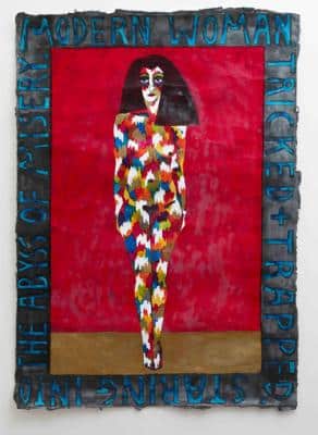 An ex-model for Paula Rego, Josephine King burst onto the contemporary art scene in 2010 with her first exhibition of self-portraits. Shockingly dark, these highly confessional works sprung from the artist’s battle with Bipolar Disorder, depicting colourful, harlequinesque figures bordered by stark texts – ‘This Illness Was My Destiny’, ‘Manic-Depression Made Me Childless’, ‘Hospitals And Clinics Are Known To Me’.