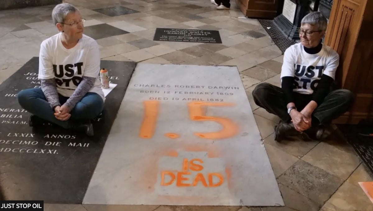 Two environmental activists who sprayed chalk paint on Charles Darwin’s grave in Westminster Abbey, London, have been charged. Alyson Lee, 66, a retired teaching assistant from Derby and Di Bligh, 77, a former chief executive of Reading Council from Rode in Somerset, protested over the weekend.
