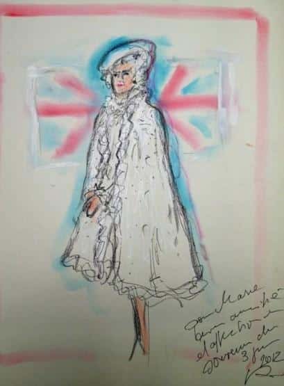 Karl Lagerfeld the creative director of the Paris based fashion house Chanel has sketched the Queen using pastels to depict her likeness. The creation took place during his on-air commentary for French TV channel France 2 ‘s, during the coverage of the Queen’s Diamond Jubilee.