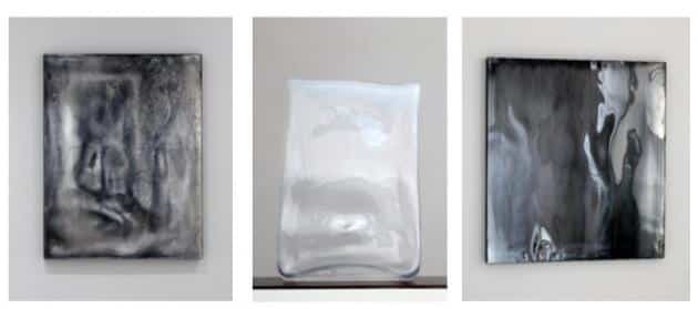 Alessandro’s passion and inspiration is water, which translates to the incredible treatment of the surface in his works, many of which have a strong, painterly quality. The YSP exhibition includes a series of wall and floor works by the artist with a complex, dark black yet mirrored patina, recalling the sense of looking into deep, reflecting pools. Using a technique applied for centuries in the production of handmade windows, a blown cylinder of glass is heated and cut, falling flat under its own weight. At this point, when the glass is typically flattened completely to remove imperfections, Alessandro works with the surface to add folds and subtle undulations. The resulting pieces have an evasive, ephemeral and fluid quality, neither mirror nor image. Unlike Laura’s more solid pieces, Alessandro works with glass that is only millimetres thick.