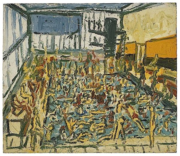 Atmosphere is key to their potency as images, and it is Kossoff’s atmosphere that gives a notion of volume and place, instead of a traditional measured use of perspective. In the swimming pool series for example, in which there is included a painting of substantial scale, it is as if all senses are engaged: the visual, the tactile, the olfactory and the auditory, as if one can smell the chlorine amidst the echoing of gleeful squeals of children splashing in the enclosed space of a London community pool. As a centre that is one of the most representative of the city’s international status replete with such evolving economic and social history, the Kings Cross series, which he began in the sixties is an interesting personal documentation of one of the most important developmental areas in the history of London. Other areas, such as Dalston, Ridley road market, Wilsden and Kilburn underground station are revisited by the artist again and again with his board, drawing media and his scrutinising gaze. Kossoff’s style seizes the moment, as if there is no time for reflection, and as if even the wind is something he snatches at, in his yearning to capture life.