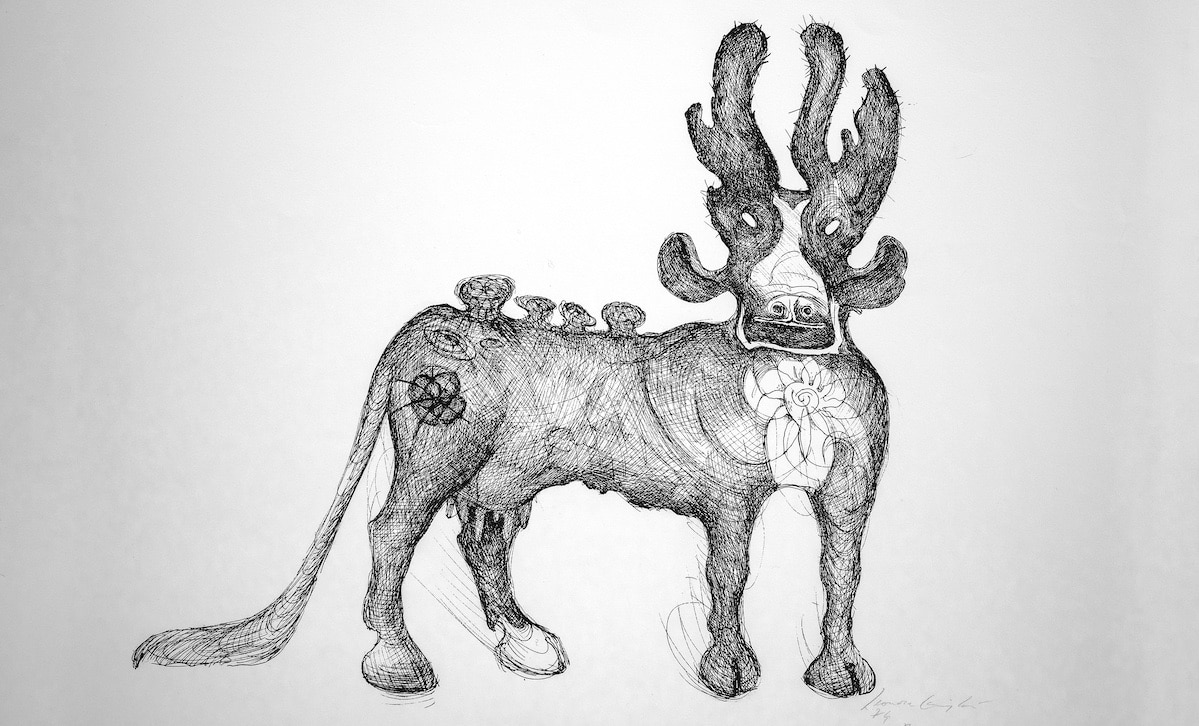 Her paintings, drawings, prints and novels are all inhabited by imaginary creatures and animals that refer to Celtic mythology, hermeticism, the Kabbalah and fantastical literature. A series of intaglio prints of beasts depicting a magical world wielding special powers and signs demonstrates her lifelong exploration of hybridity and androgyny through transitional beings and avatars. Here, the Albino raven drinks “all the darkness from heaven”, the “blue healing spirit” of the Ox “Follows your shadow / Into the deepest ravines of the It”, and the labyrinth within the flesh of the Tapir enables “the ones with / Reversible thoughts” to use it “As a prayer wheel”.